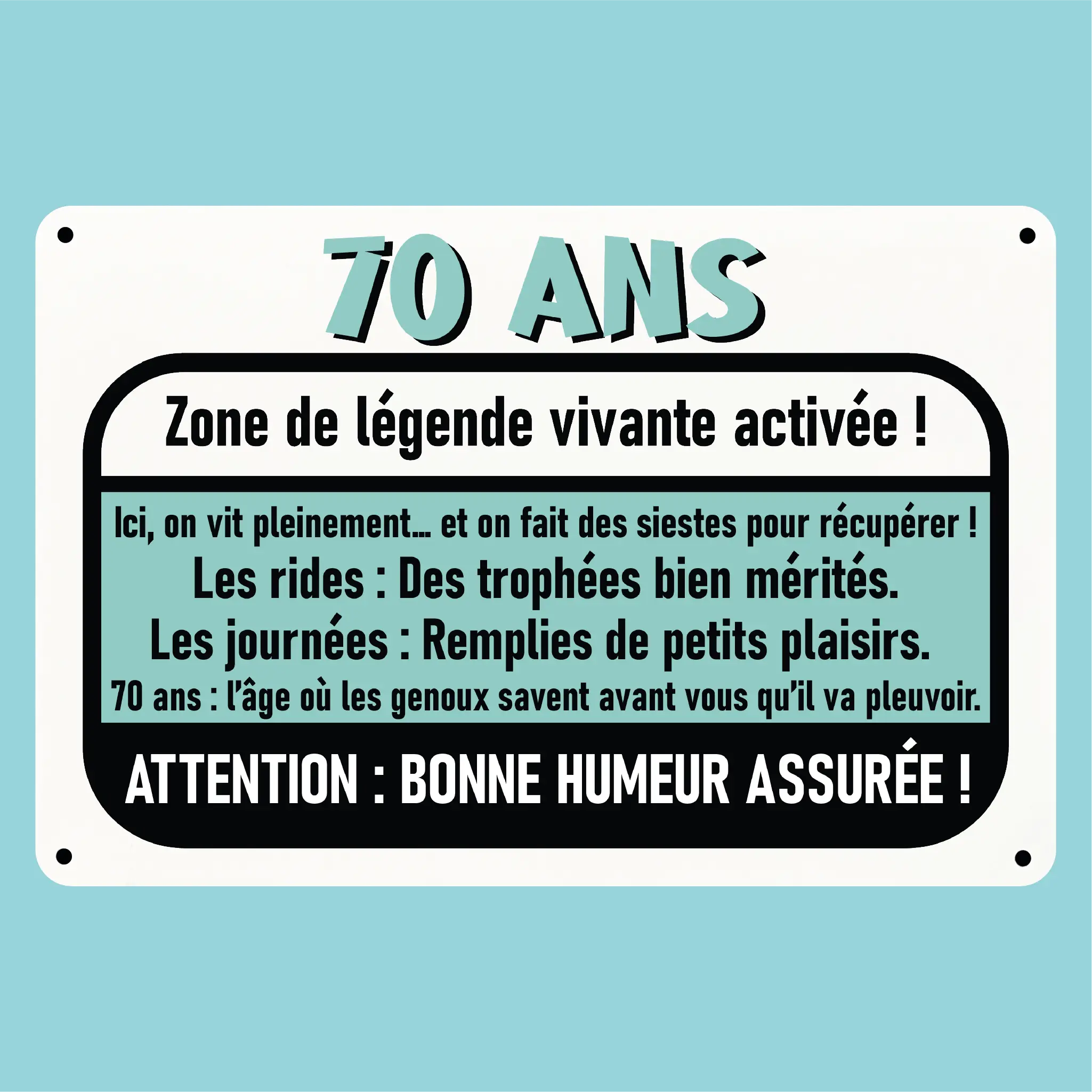 Plaque humoristique: 70 ans zone de légende vivante activée